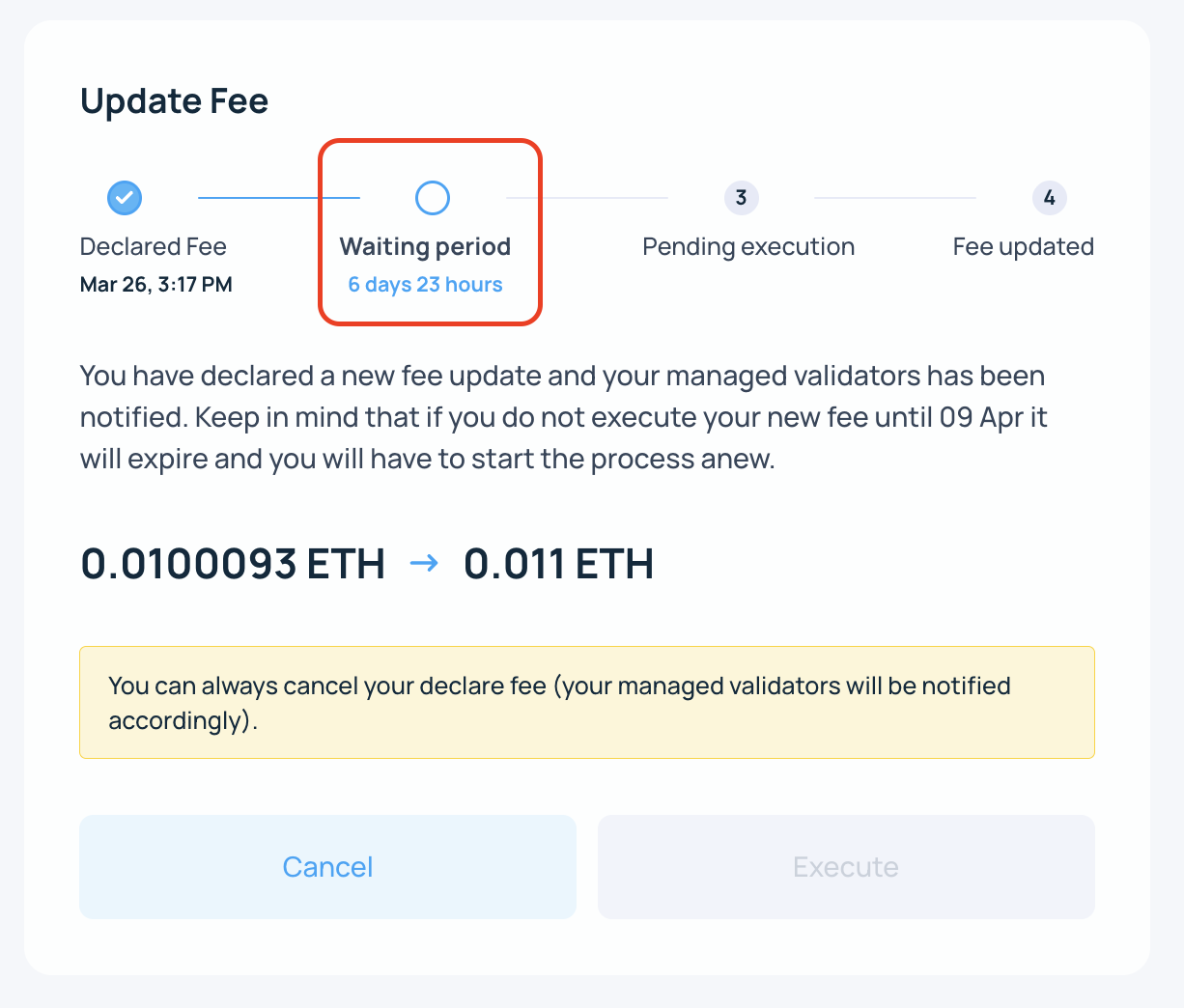 You can cancel the fee update at any time, but you must wait for the waiting period to end before you can Execute.