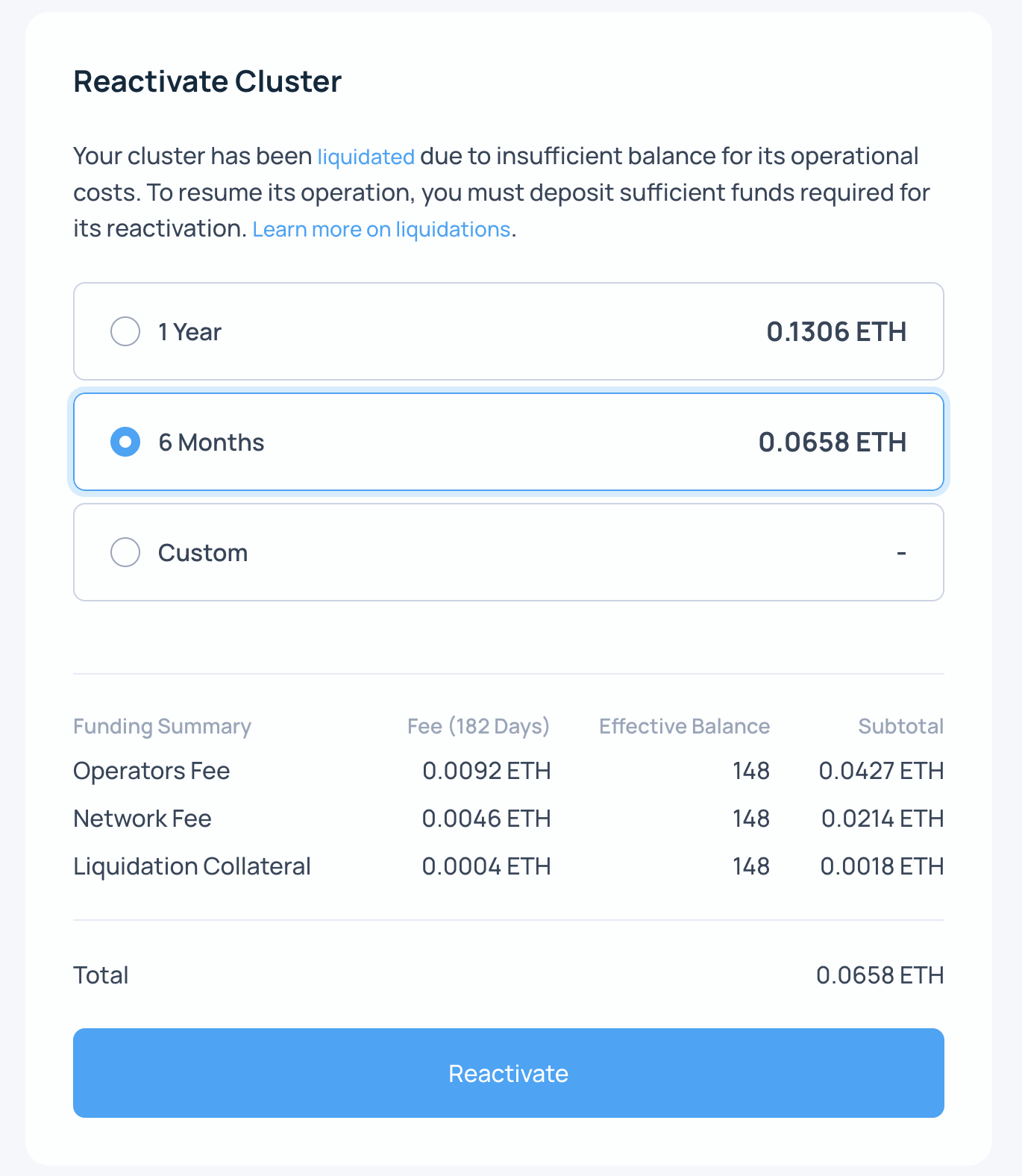 If the actual effective balance is lower than the value you enter here, the fee burn rate will be higher and may result in a liquidation of a cluster.